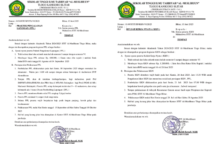 Diberitahukan kepada seluruh mahasiswa Semester VI, bahwasannya berdasarkan kalender akademik STIT Al-Muslihuun mengenai jadwal pelaksanaan Sosialisasi KKN dan PPL dilaksanakan pada tanggal 28 Juni 2025, karena ada sesuatu hal maka kegiatan Sosialisasi KKN dan PPL akan dimajukan dan dilaksanakan pada Rabu, 26 Juni 2025.